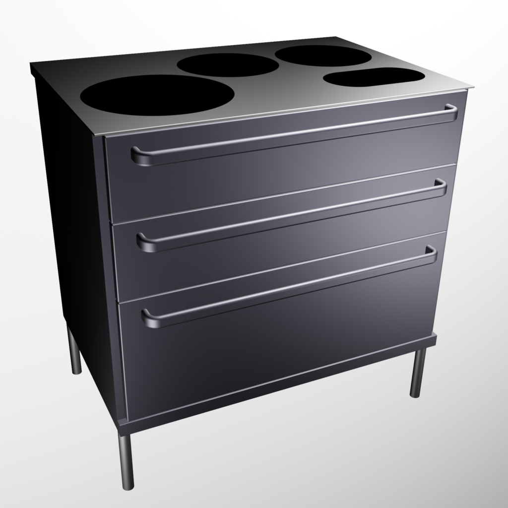 Ladekast met drie lades en modulaire inductiekookplaat. Componenten: één kookplaat 3500 W, twee kookplaten 2700W en bedieningspaneel.